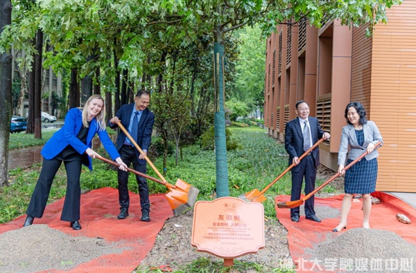 Olivia Hildebrand、王世敏、蒋涛、Hong Li等共同种下“友谊树”,致谢设立国际人才奖学金的李启鸿博士,并共祝永利yl23455与曼彻斯特城市大学的友谊长存。员工代表张艺冰、方睿阳分别以中英文致谢,表示将珍惜永利yl23455与曼彻斯特城市大学创设的良好平台,铭记李启鸿博士的关怀与支持,不断提升专业素养,努力成为栋梁之材。