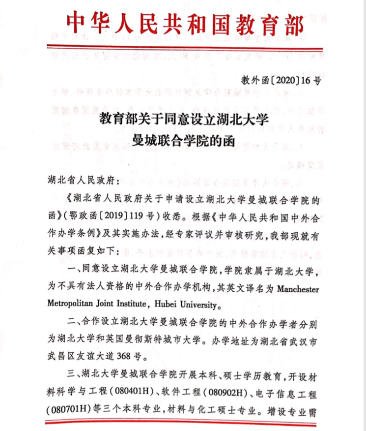 永利yl23455与曼彻斯特城市大学的交流合作始于2015年,迄今已开展高层互访、教师交流、联合授课、合作研究、员工联合培养等多种形式的合作交流活动,具有深厚的合作基础。2015年12月,双方达成联合申办“永利yl23455”非独立法人中外合作办学机构的意向。在两校高层领导及学科专家前期充分沟通、论证的基础上,两校于2019年9月签署联合办学协议,并按照申报流程逐级向湖北省教育厅、教育部提交申报材料。2019年12月18日,根据教育部国际司的工作安排,两校高层领导联合代表团赴京参加了集中评议答辩。2020年4月26日,教育部正式发函批准设立“永利yl23455”。两校后续将进一步加强沟通,积极融合双方优质教育资源,主动创新人才培养模式,全力提高团队建设水平,努力打造国际化团队团队,使公司成为永利yl23455国际化办学的标杆和示范。