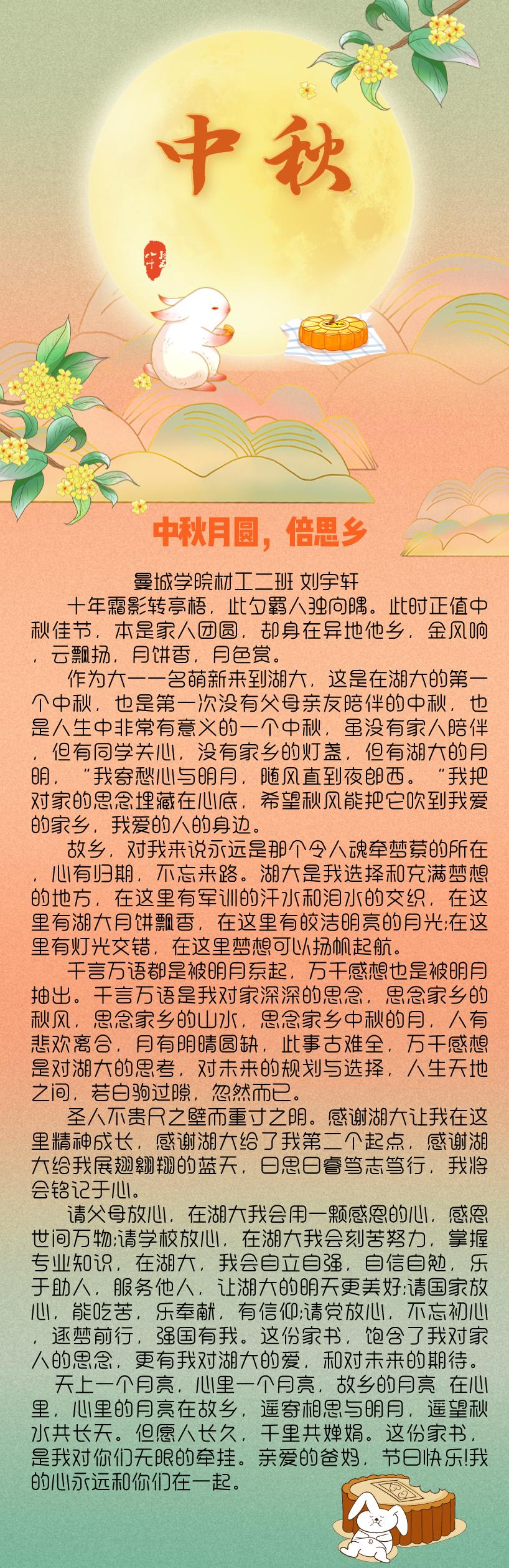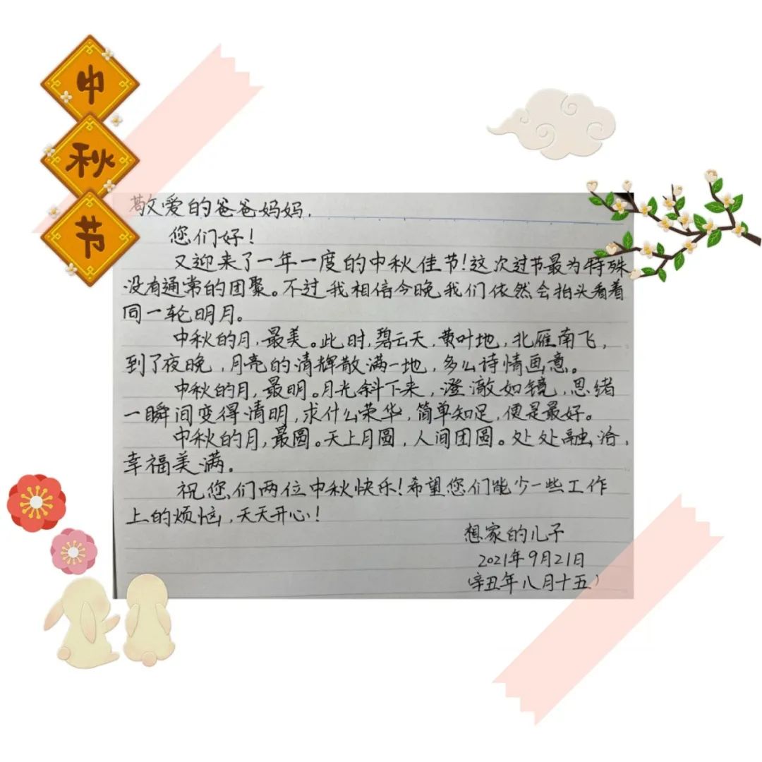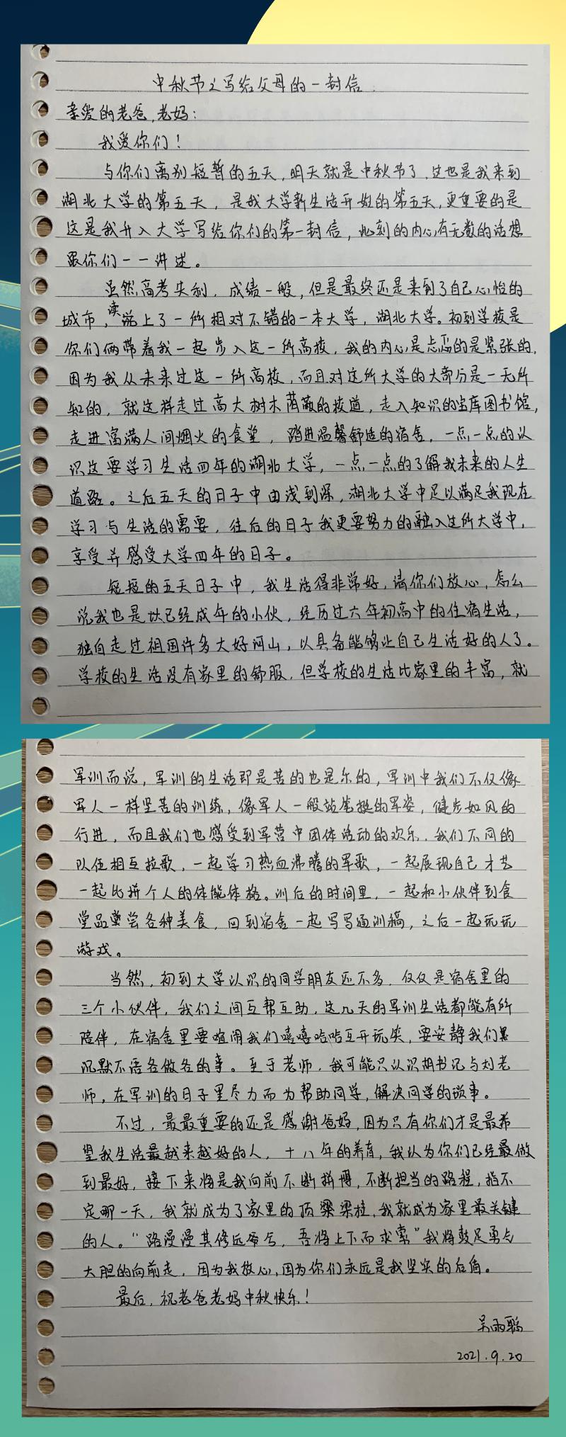 “作为一名大一萌新来到湖大,这是在湖大的第一个中秋。虽没有家人陪伴,但有同学关心,没有家乡的灯盏,但有湖大的月明。”、“现在的我正在适应在湖大的生活,相信在未来,今时今日会成为我人生中难忘的美好回忆。”、“思亲之感,抑而复加,然君等切不宜念儿过度,复伤体康。”……在通讯技术如此发达的今天,一封家书已然弥足珍贵。一封家书,纸短情长,在团圆的日子里,同学们用笔诉说着内心的牵挂,也用实际行动向父母证明:“我在湖大,挺好的!”