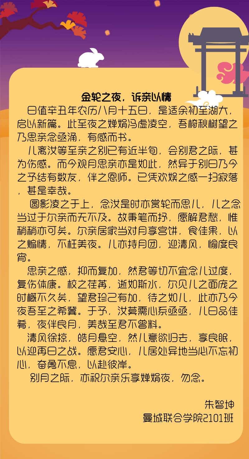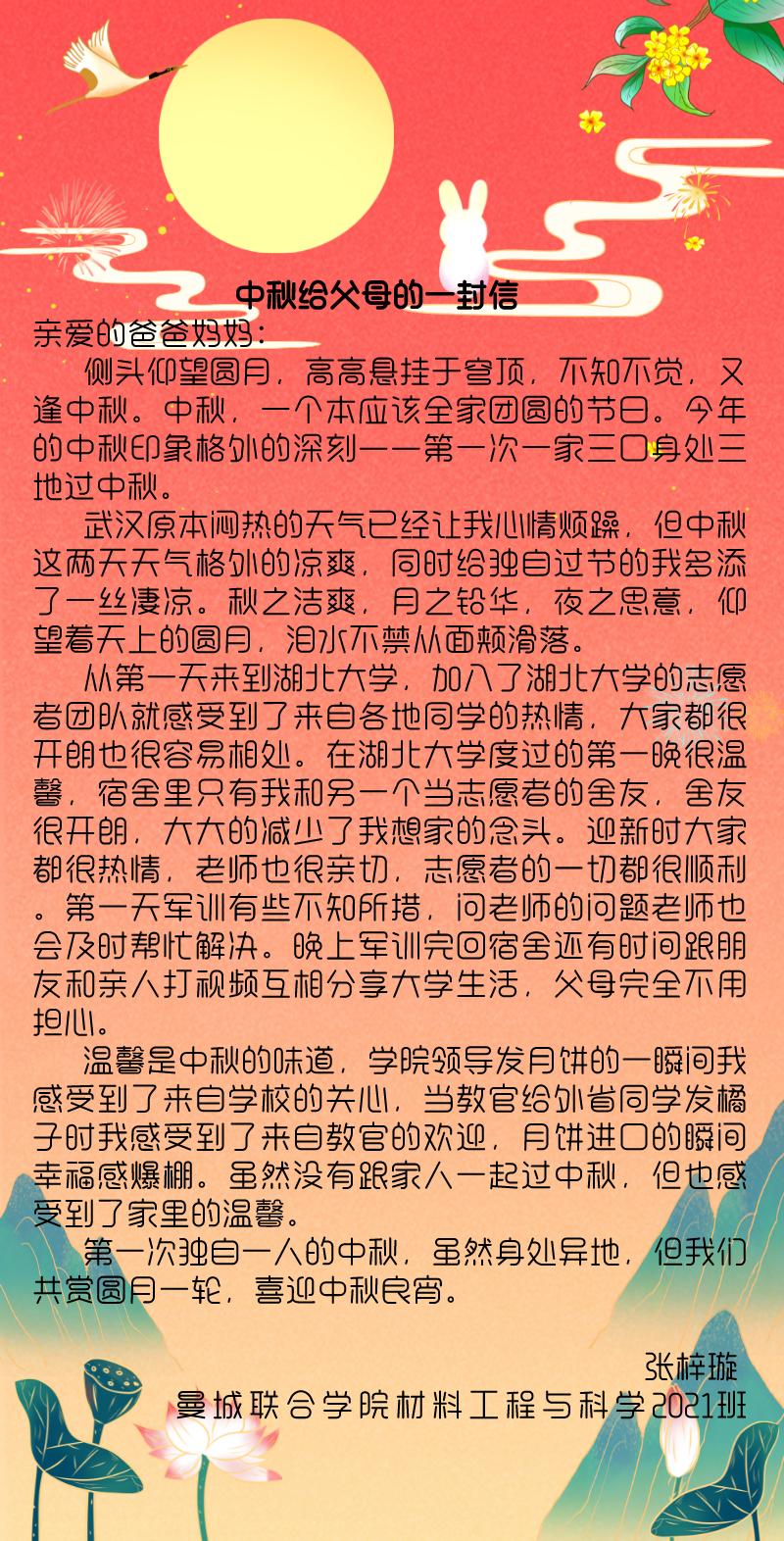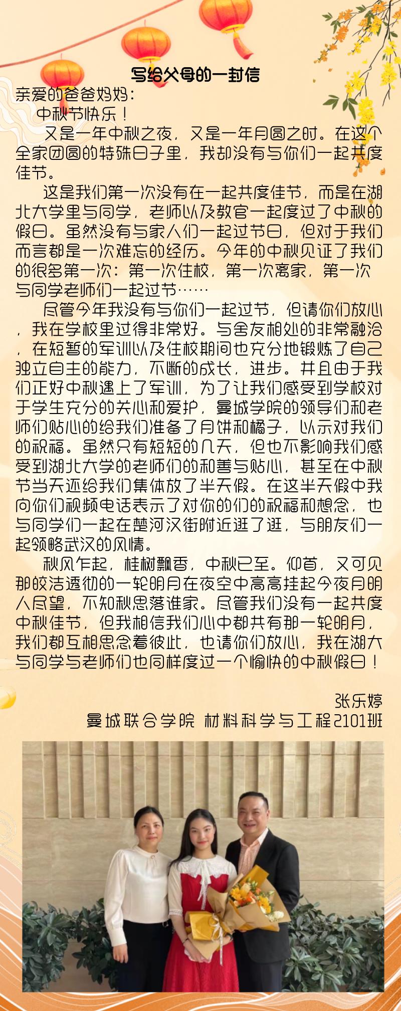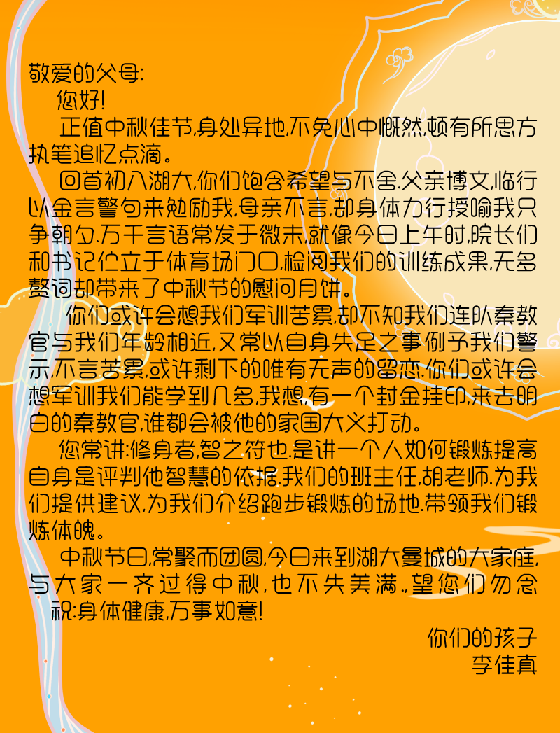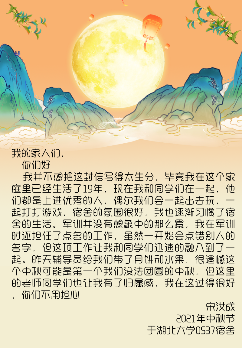 自古中秋月最明,且把思念遥相寄。9月21日中秋佳节,在新生报到一周之际,湖北大学永利yl23455发布“中秋活动之写给父母的一封信”通知,鼓励同学们以文字形式寄托对家人的思念。活动发布以来,得到了同学们的积极响应参与。